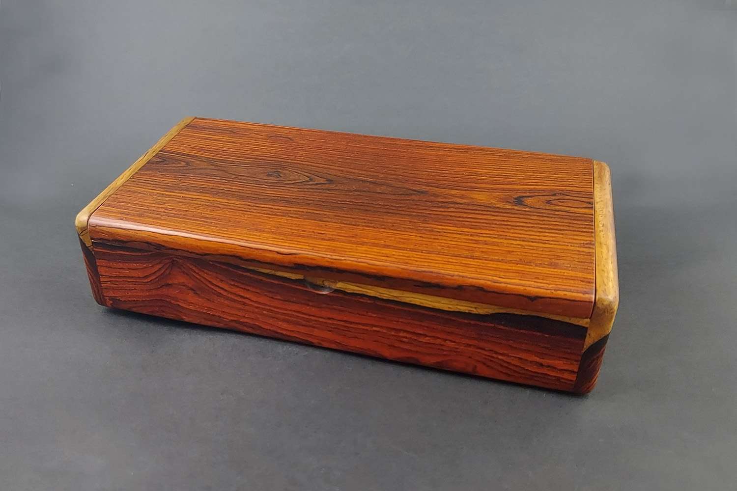 Large pegged box with velvet lining. Made of cocobolo rosewood, one of the finest woods in the rosewood family, a wood so dense it sinks in water. Made to last for generations. All edges are rounded, including the bottom, and sanded and finished to a high standard, so the box feels silky smooth to handle.
